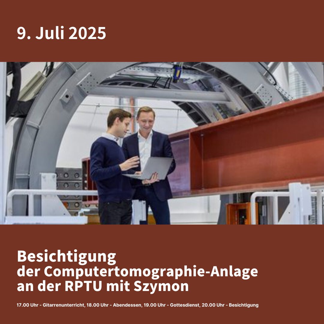 Gemeinsam einen riesigen Computertomographen an der RPTU besichtigen mit Szymon! 9. Juli 2025 | 17:00–22:00 17.00 – Gitarrenunterricht, 18.00 Uhr – Abendessen, 19.00 – Gottesdienst, 20.00 Uhr – RPTU