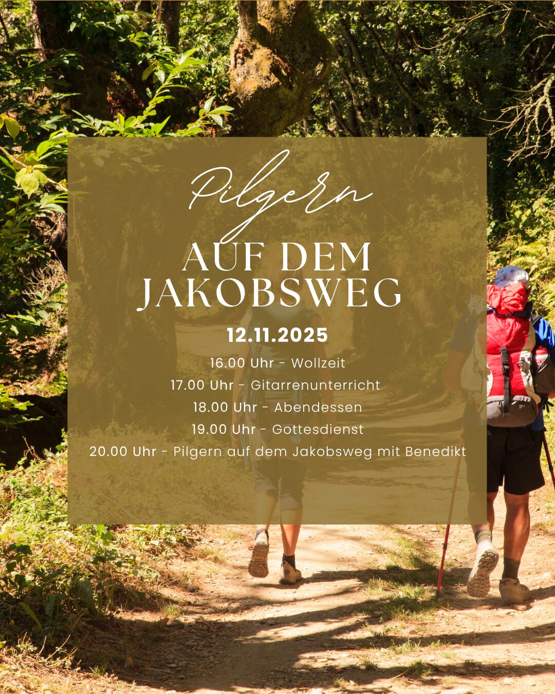 16.00 Uhr – Wollzeit, 17.00 Uhr – Gitarrenunterricht, 18.00 Uhr – Abendessen, 19.00 Uhr – Gottesdienst, 20.00 Uhr – Pilgern auf dem Jakobsweg, ein Erfahrungsbericht von Benedikt Haas.