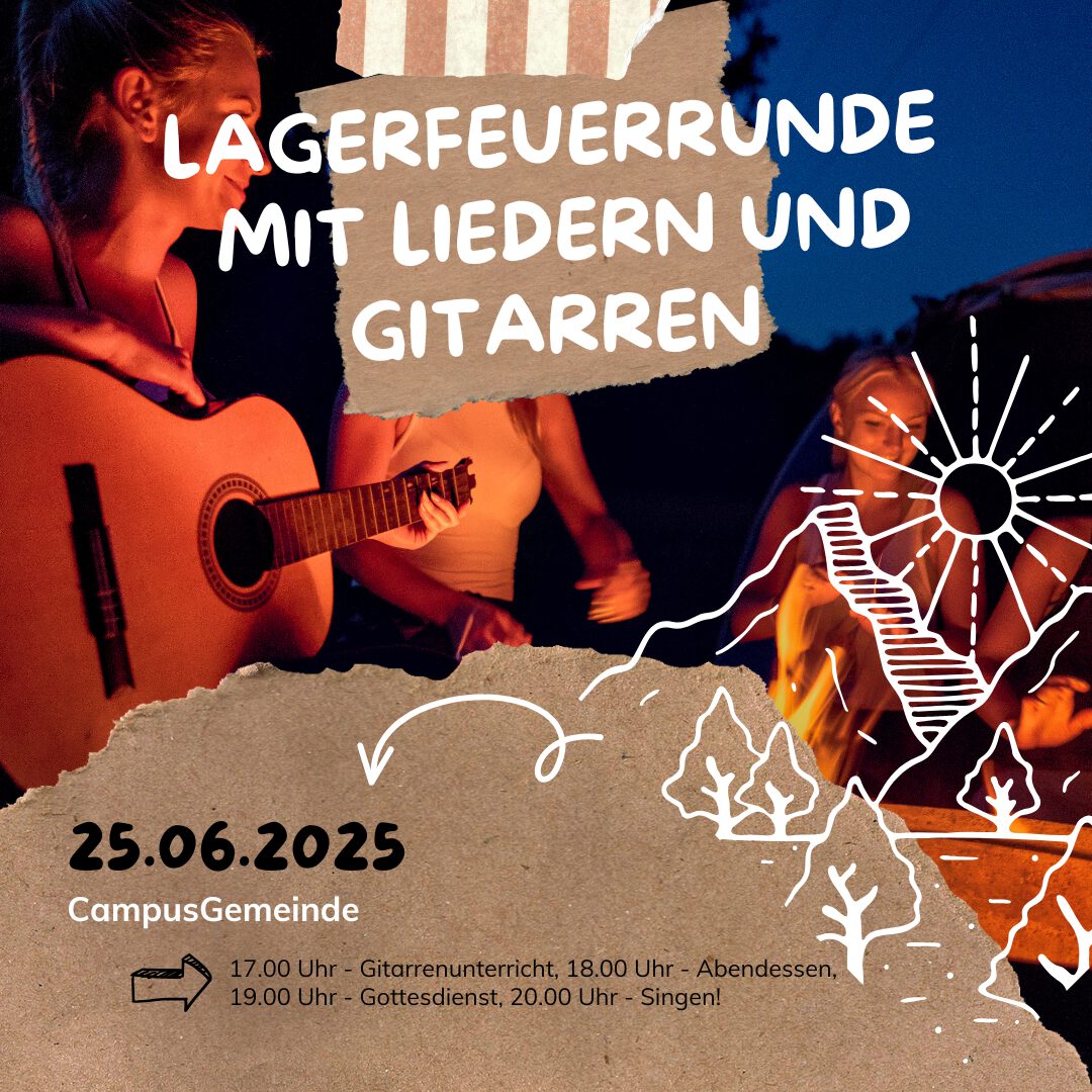 17.00 Uhr – Gitarrenunterricht, 18.00 Uhr – Abendessen, 19.00 Uhr – Gottesdienst, 20.00 Uhr – Singen!