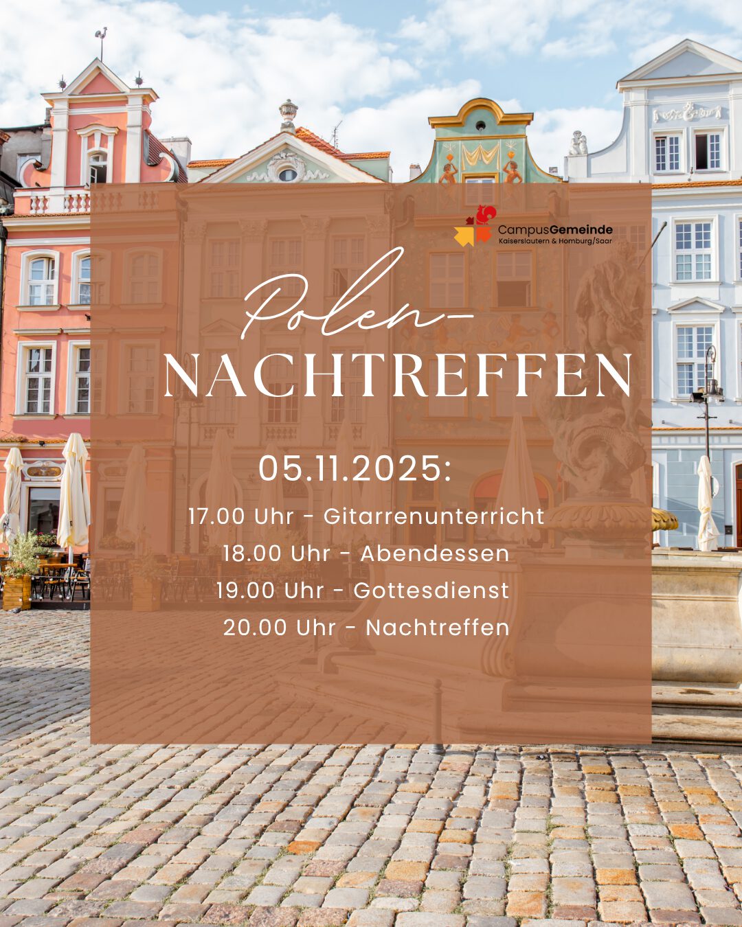17.00 Uhr – Gitarrenunterricht, 18.00 Uhr – Abendessen, 19.00 Uhr – Gottesdienst, 20.00 Uhr – Polen-Nachtreffen mit spannenden Reiseeindrücken für alle Interessierten