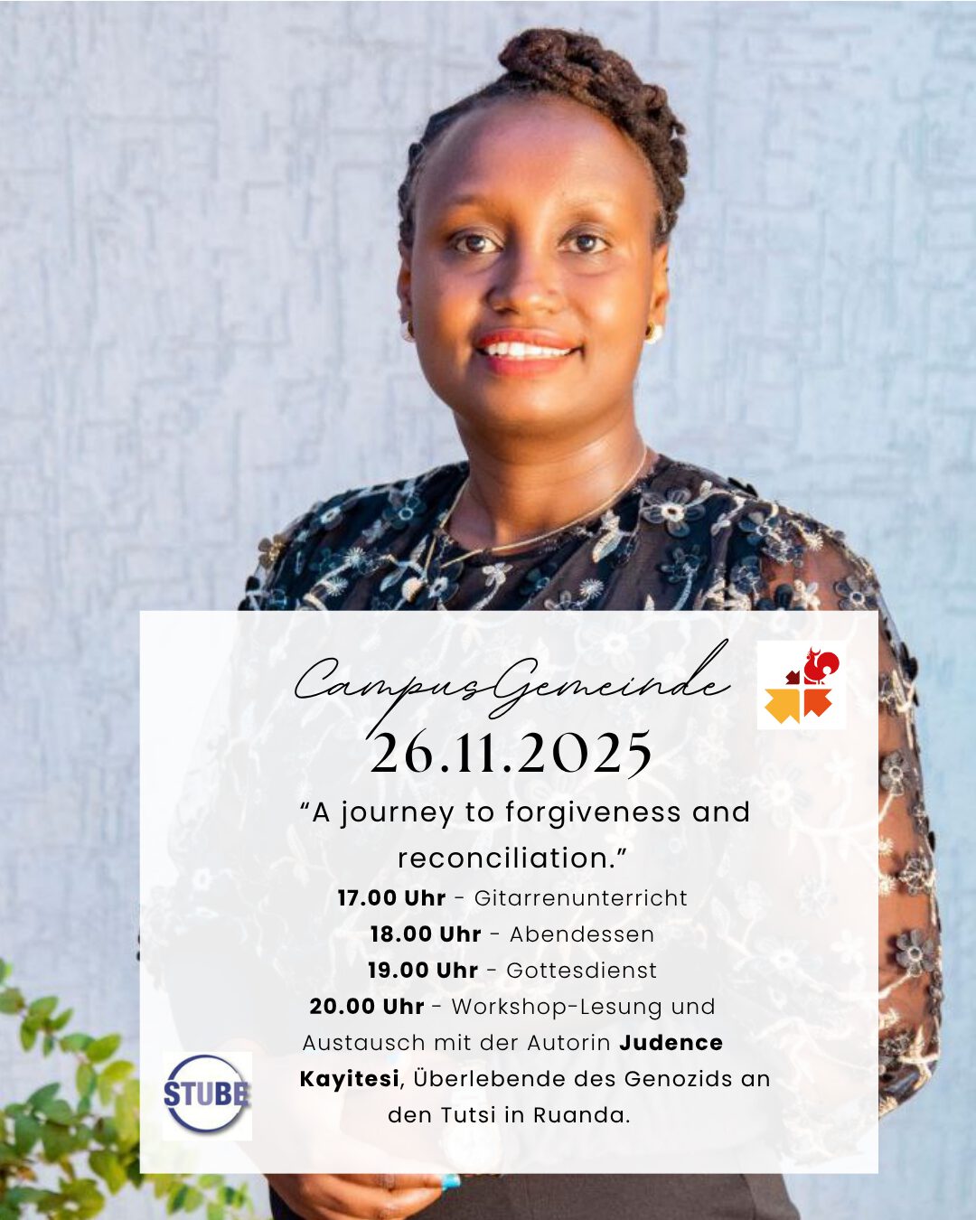 Wir laden euch herzlich zu einem besonderen Treffen mit der ruandischen Autorin Judence Kayitesi, Überlebende des Genozids an den Tutsi in Ruanda ein. Sie wird über ihre Bücher, ihre persönlichen Erfahrungen und ihre Arbeit für Frieden und Versöhnung sprechen.